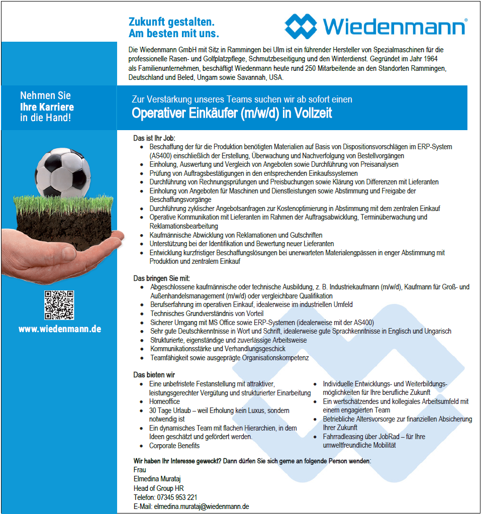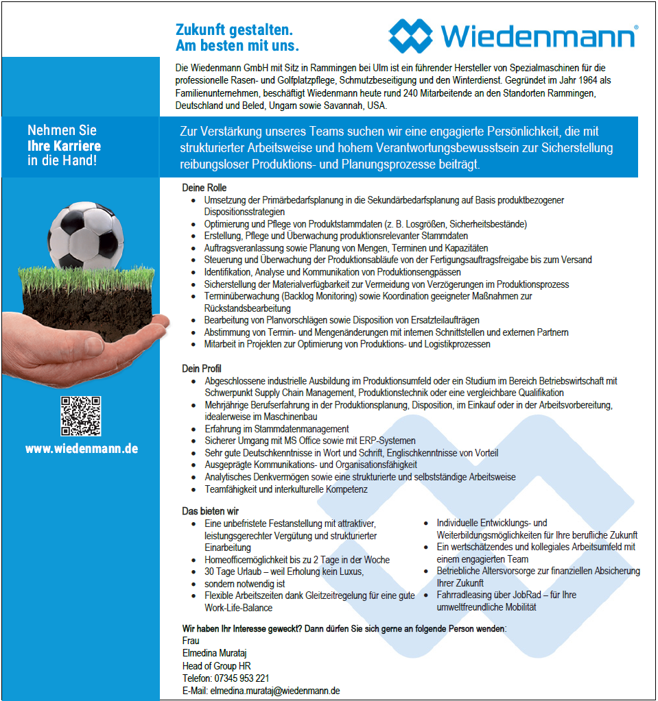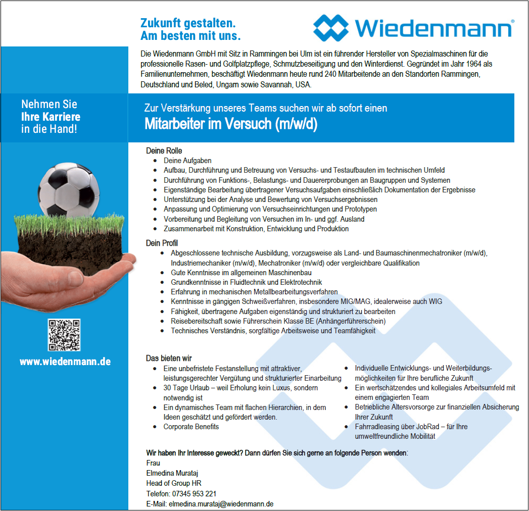 Neben der fachlichen Kompetenz unserer Mitarbeiter/innen ist ein gutes Arbeitsklima Grundlage für hohe Qualität unserer Produkte. Bei der Wiedenmann GmbH bedeutet das: flache Hierarchien, projektbezogenes Arbeiten, hohes Engagement aber auch attraktive Sozialleistungen in einem wirtschaftlich starken und finanzkräftigen Unternehmen.